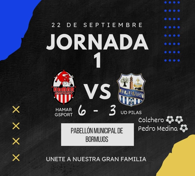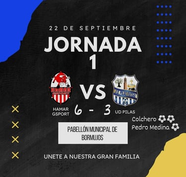 Este Domingo 22 de septiembre se disputo el partido en casa de HAMAR GSPORT en el Pabellón Municipal de Bormujos. Hemos salido derrotados por 6 - 3 pero hay que quedarse con lo bueno, muchas caras nuevas y mucho trabajo por delante, hay que seguir entrenando y dando la cara y poco a poco irán llegando mejores resultados, vamos chavales, esto es parte del aprendizaje, a seguir peleando.